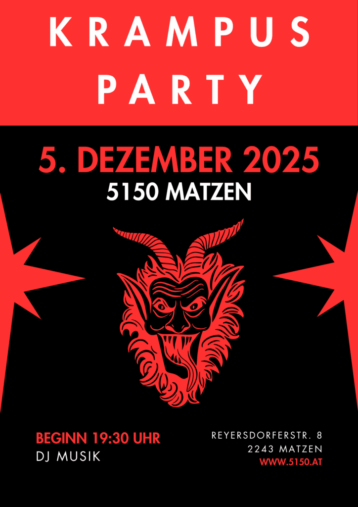 News | Neuigkeiten Bleiben Sie auf dem Laufenden mit den neuesten Nachrichten und Ereignissen von 5150, Ihrem exklusiven Veranstaltungsort in Matzen, wo Musik und Begegnung in einem einzigartigen Ambiente verschmelzen. 5. Dezember 2025 - KRAMPUS PARTY 31. Dezember 2025 - SILVESTERPARTY